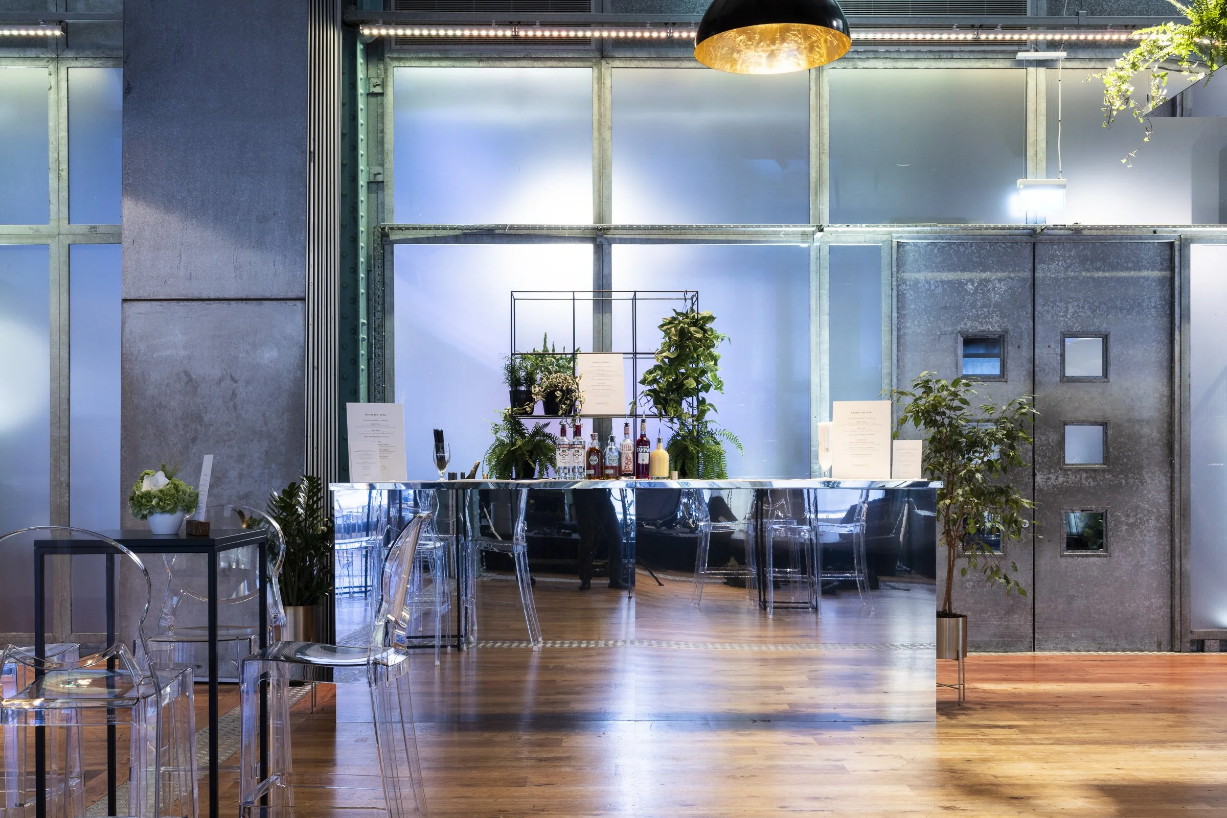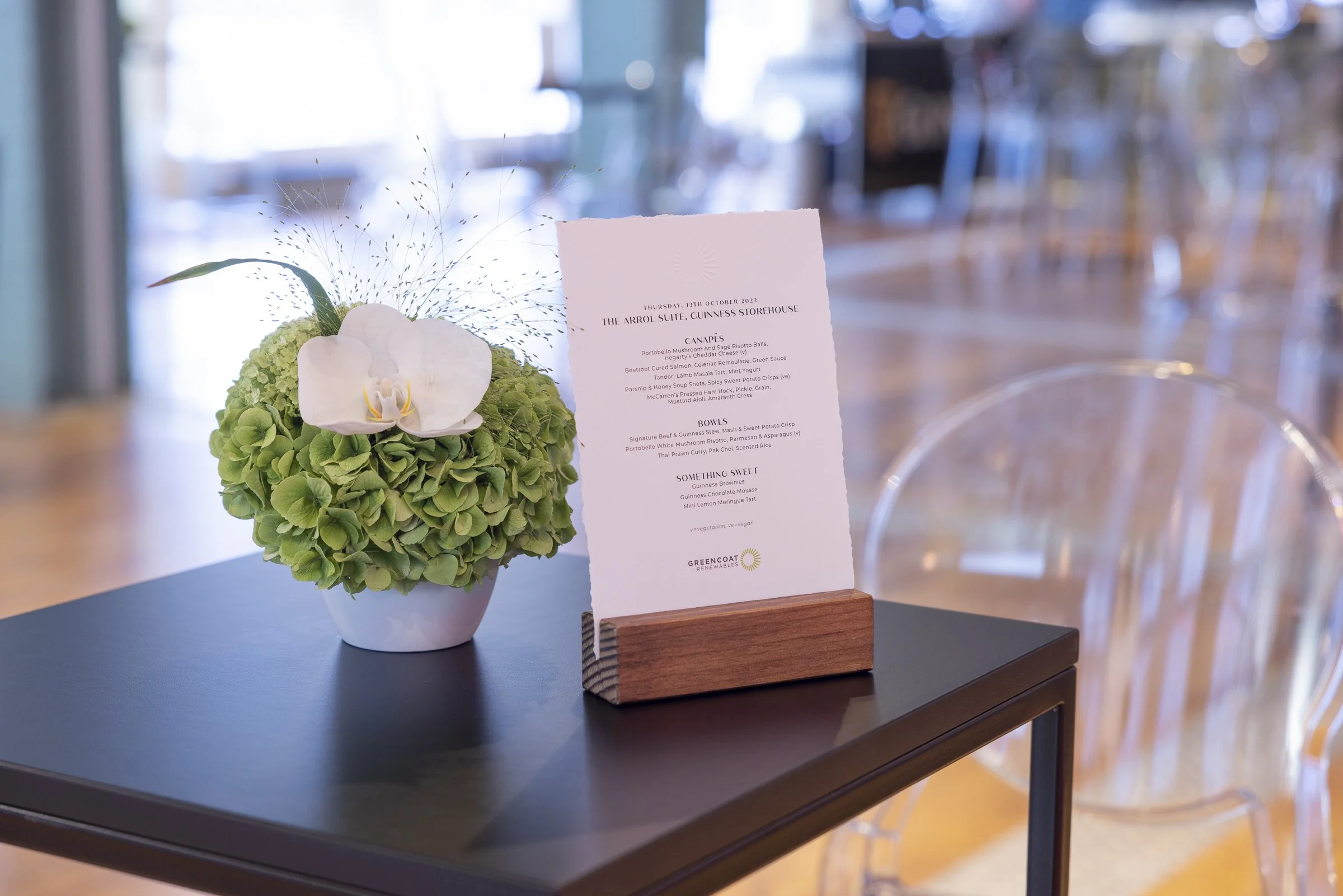 Greencoat Renewables, a pioneer in renewable energy investment management, celebrated their fifth birthday at the Guinness Storehouse and we were tasked with transforming the Arrol Suite into a futuristic oasis that encapsulated the company's vision of the future. We used our grid wall backdrop, decorated with various greenery, and built around the house projection screen to make up the stage area. We continued the green theme throughout the space, fitting hanging mirrored planters from the ceiling which were also decorated with hanging plants. We combined two of our mirrored bars to make a cocktail area with a planted gridwall backbar. Custom-made leather seating spaces were dispersed throughout the Arrol suite to give the occasion a relaxed, laid-back vibe. Black metal frame tables (provided by our sister company: HIRE LOVE) were matched with our igloo high stools to provide guests with a place to sit and enjoy their all-important cocktails.
