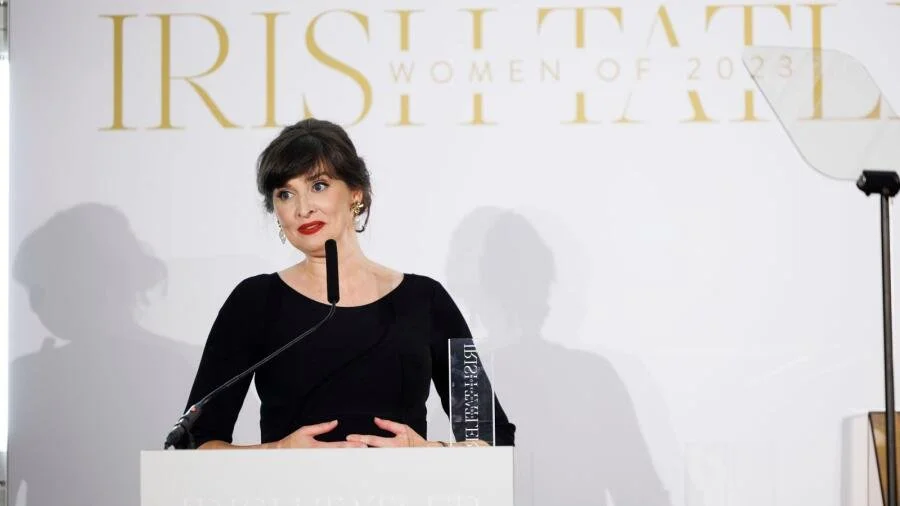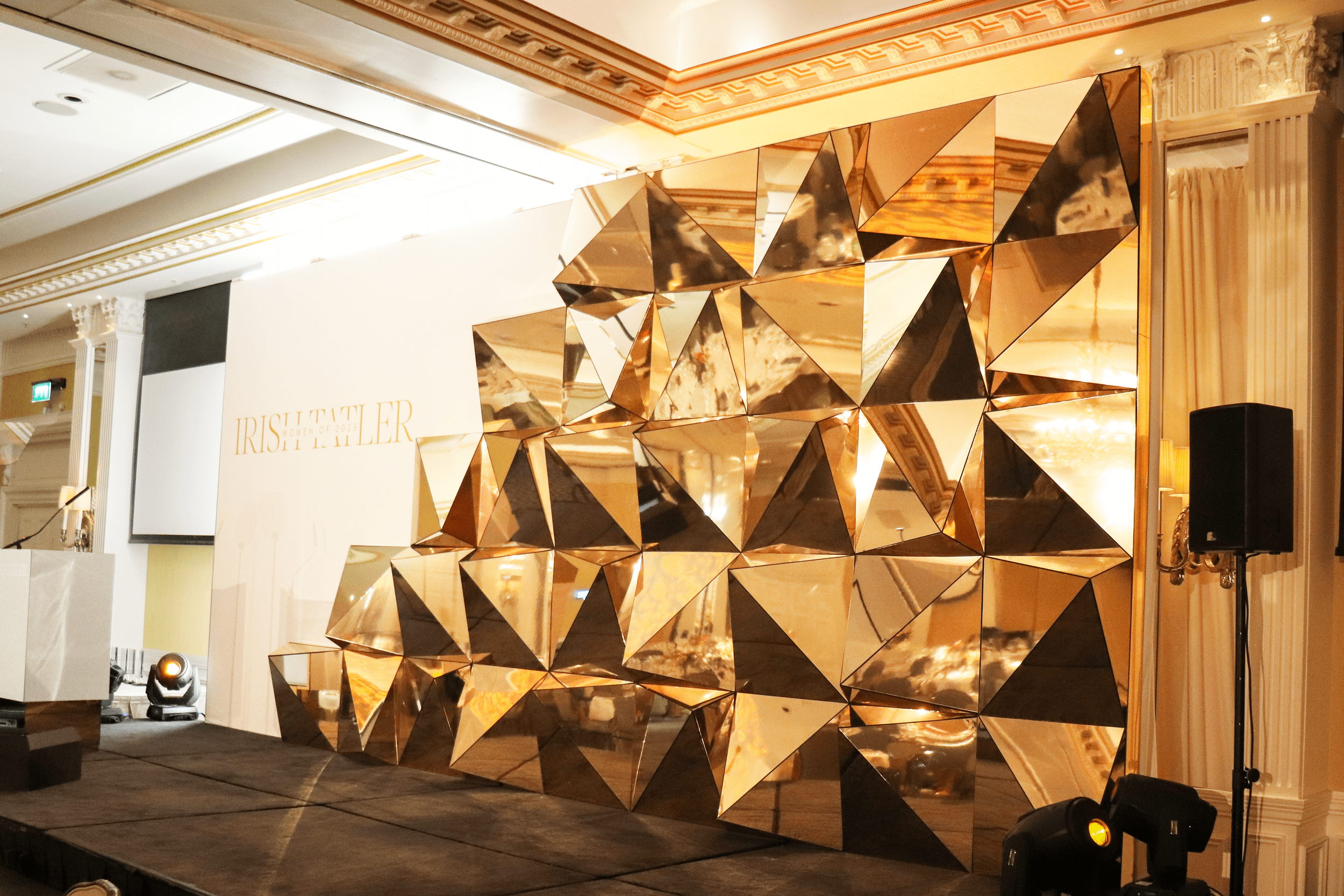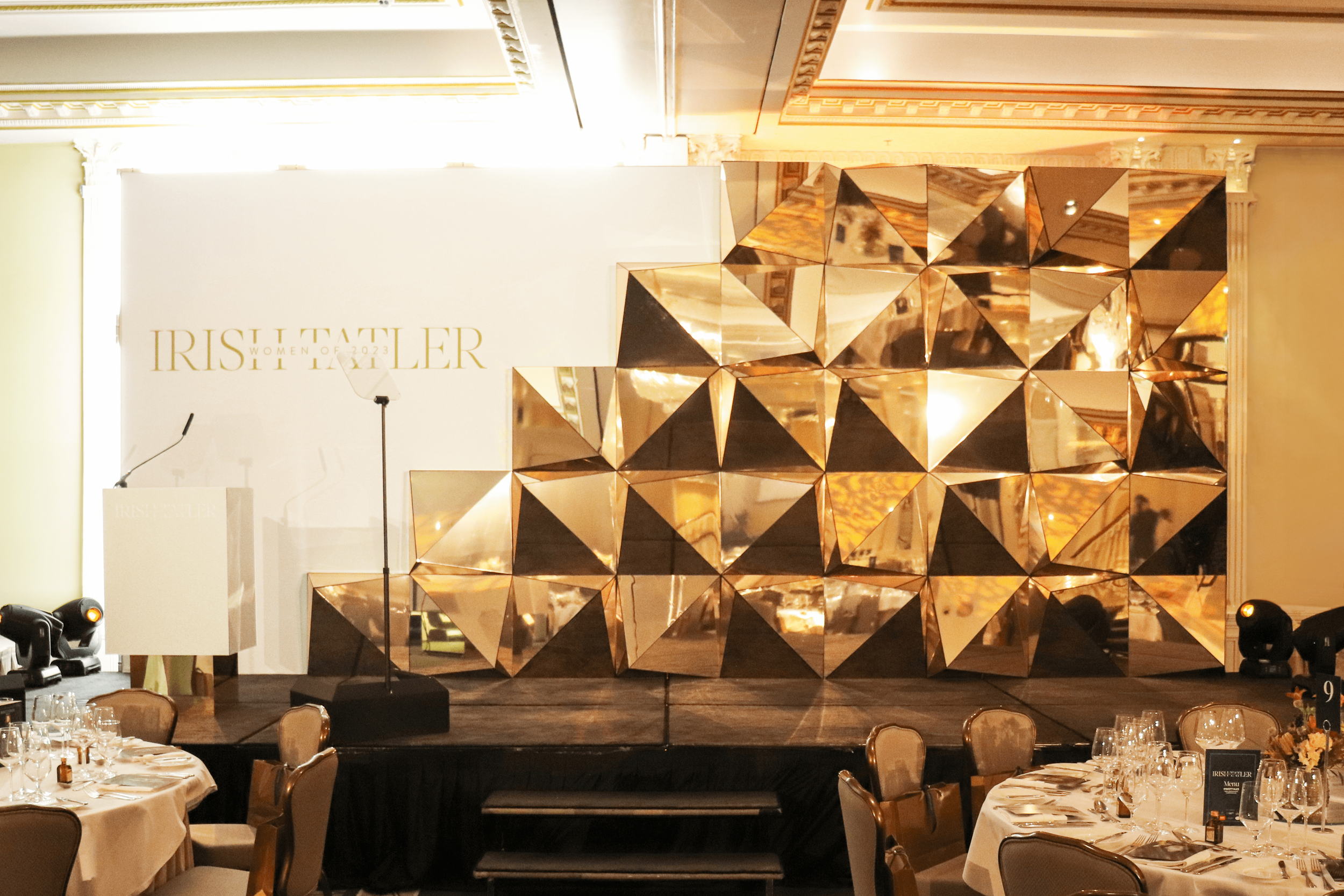 The Irish Tatler Women of the Year Awards 2023 is Ireland's original and most prestigious event for female achievement, and we were tasked with creating a stage set fit for the occasion. Our aim was to design an elegant yet visually impressive stage that conveyed the significance of the awards. We created a set comprising a printed stretch fabric backdrop paired with staggering gold facet panels. White stick lights surrounding the printed backdrop illuminated the stage. We fabricated a brand new lectern for this event, which we are calling our Cube Lectern (Check it out on our Rentals Page).