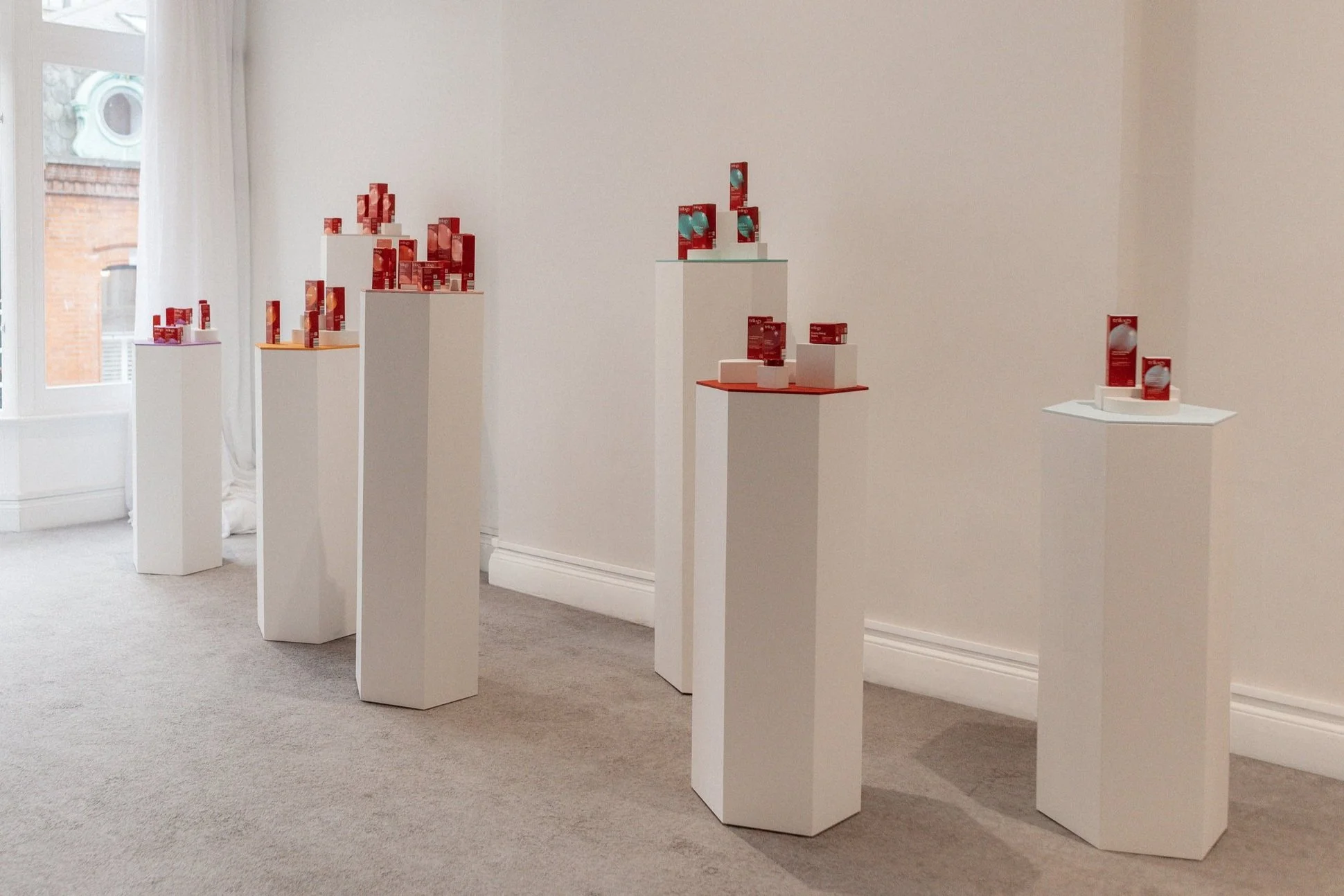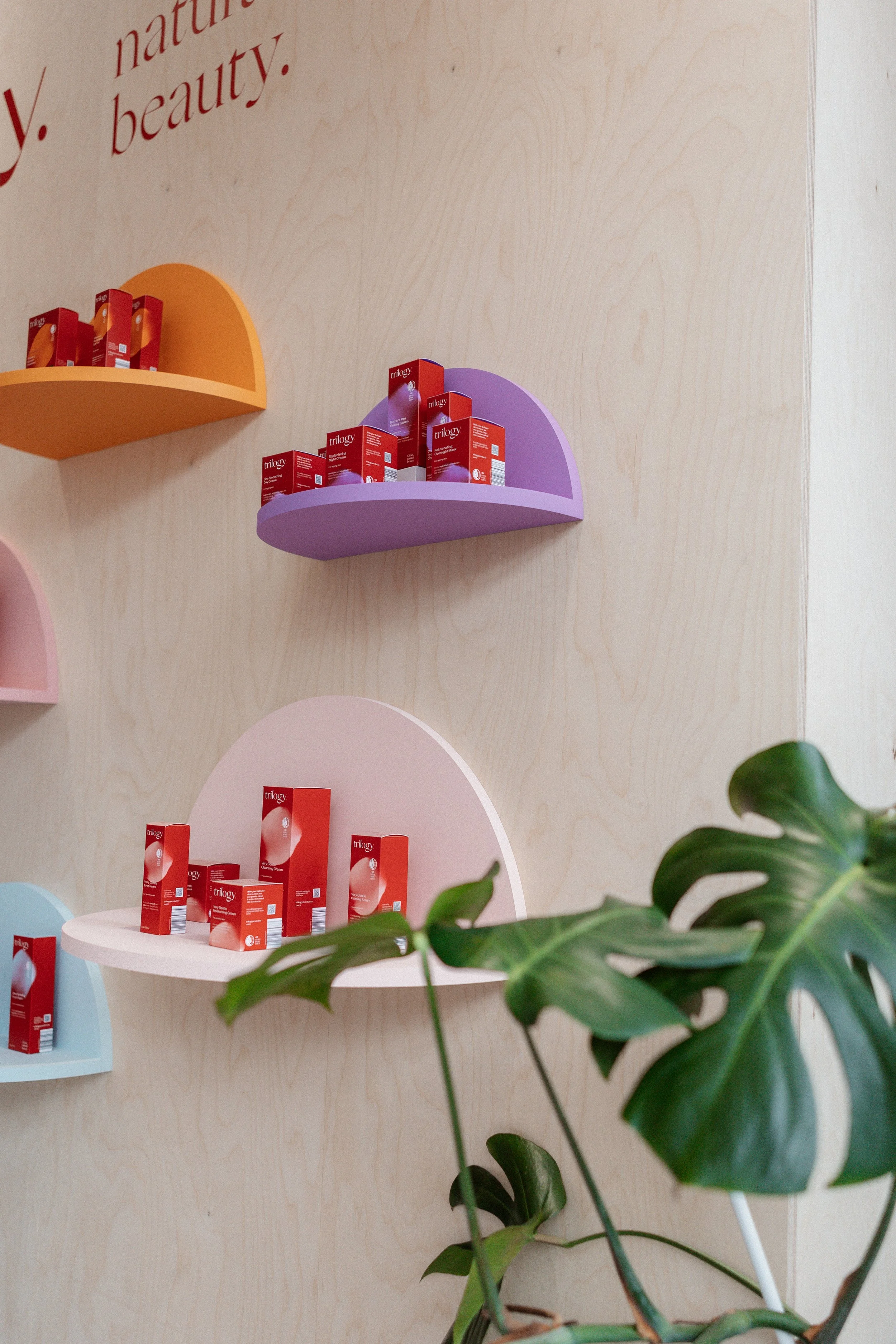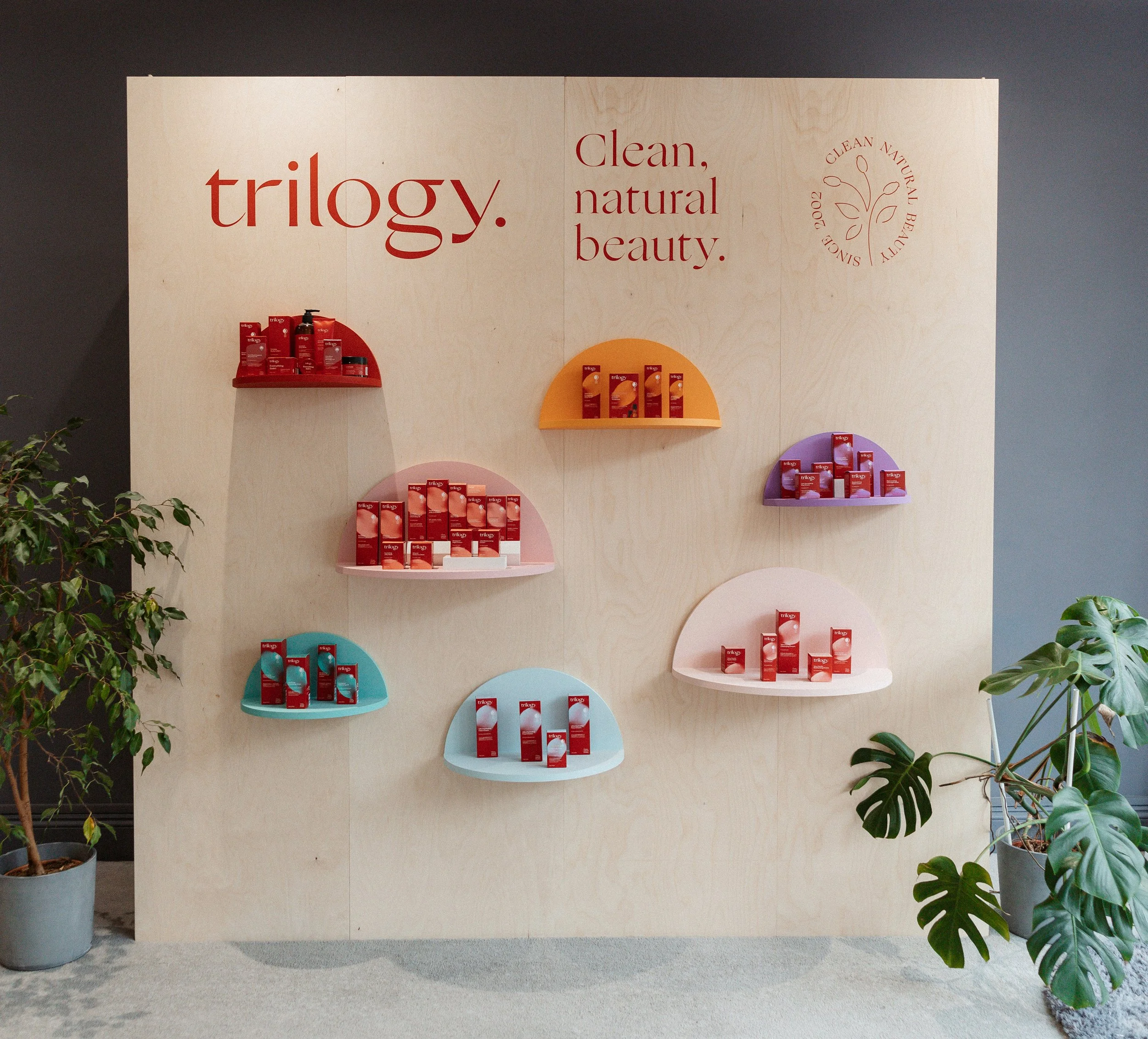 Trilogy has been New Zealand's leading natural skincare brand for 9 years and they recently introduced a vibrant new logo and packaging design across its range. Our challenge was to showcase the new look at Studio 10, Dublin. Using birch plywood and an array of colours representing each of the brand's seven skincare collections we created a custom product wall which doubled as a photo backdrop. The colour range was also used to stamp the new brand identity on display plinths and shelving. White styling blocks and planting were used to amplify the natural vibes